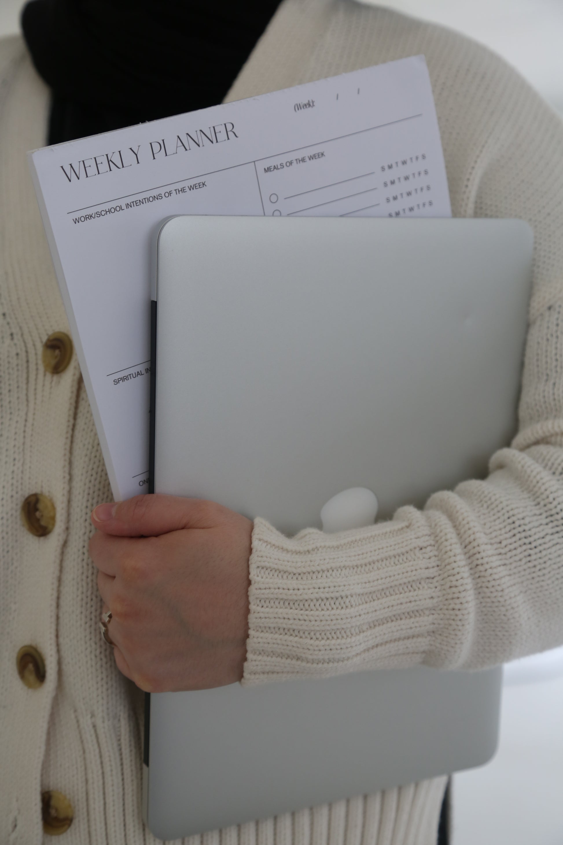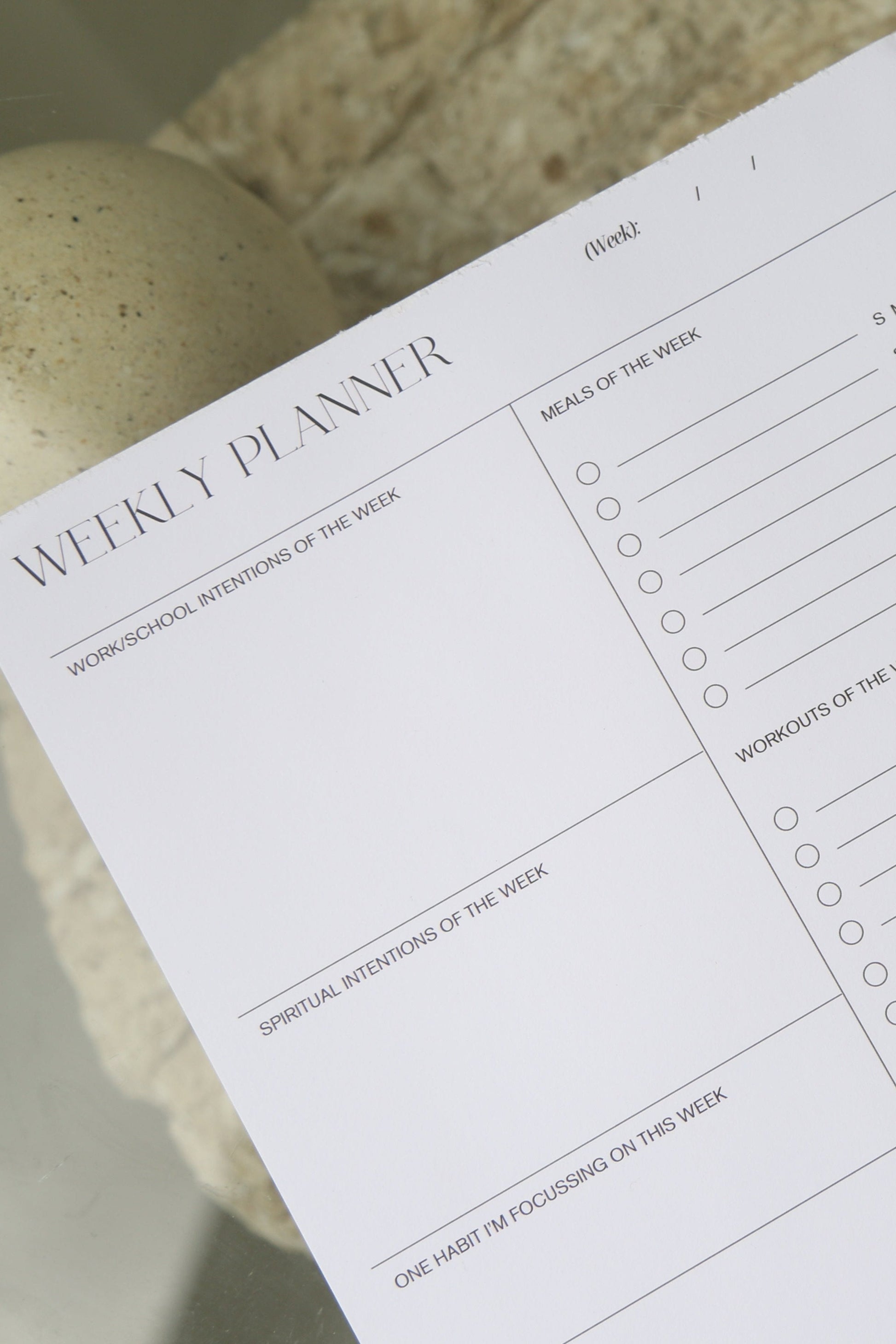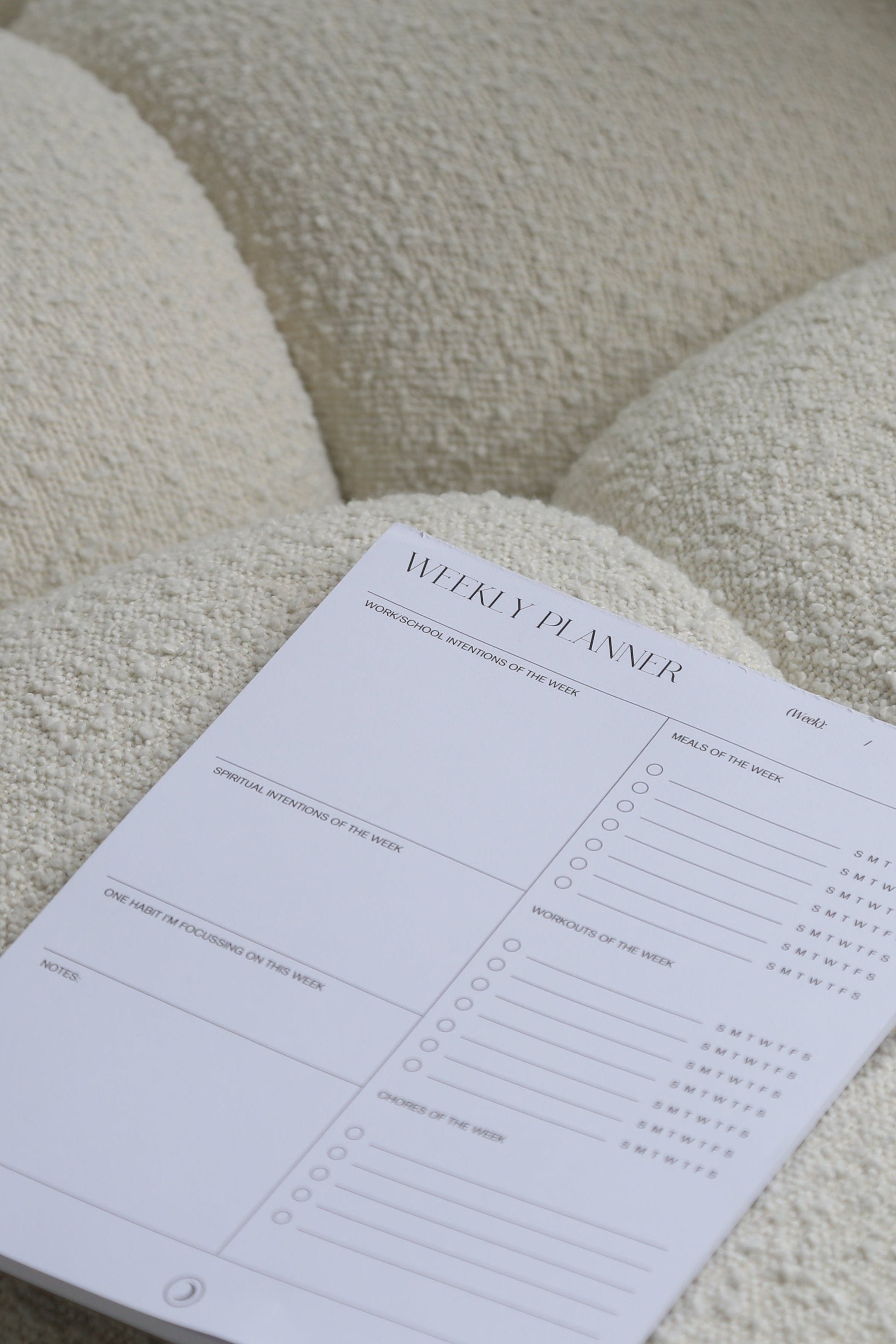 - Dedicated sections for work/school intentions, spiritual intentions, workouts, meals, notes, and chores of the week.